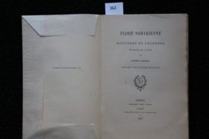 LARGEAU (Victor) – Flore Saharienne. Histoires et légendes traduites de l'arabe par Victor Largeau. Publiées par Gustave Revilliod. Genève, Jules Sandoz Paris, Sandoz et Fischbacher 1879, in-8° (15 x 22 cm) de 2ff.- 228 pp. broché, couverture imprimée. Bel exemplaire, état quasi neuf. Rare. Réf. : Numa Broc 191 et sq. « Victor Largeau (1842-1896) fit deux tentatives pour traverser le Sahara par Ghadamès en 1874-1875 et pour gagner Tombouctou en1877 ».