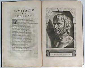 Quatrième édition plantinienne (éd. orig. : 1605) donnée par Juste Lipse (1547-1606) avec ses commentaires mais première revue et complétée par Libert Froidmont. L'ouvrage contient l'"Apocolocyntosis divi Claudii" (ou transformation de l'empereur Claude en potiron !), ouvrage satirique particulier dans l'oeuvre du grand philosophe. Illustré, souvent par Corneille Galle, d'1 frontispice représentant le portrait de Lipse en médaillon, d'1 joli titre gravé avec les portraits en médaillons de Sénèque, Épictète, Zénon, Cléanthe, Hercule, Athéna et Ulysse dans un décor architectural, de 3 portraits de Sénèque (dans une bassine, en buste et in texto dans le "De vita et scriptis") et d'1 in texto représentant des os de chien et de bovin. Texte orné de lettrines et culs-de-lampe. # BB V-135/136; # Graesse VI-348; # Brunet V-276.