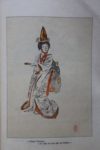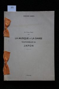 MORITA (Geneviève) – Un coup d'œil sur la Musique et la Danse traditionnelles au Japon. S. l. [Probablement au Japon], 1936. Petit in-4° (19 x 26 cm.) broché à la japonaise avec 2 nœuds de tissus décoratifs orangés, de 29 pp. de texte plus 16 planches en couleurs. État neuf. Sous le pseudonyme de Tormia, l'auteur avait publié ‘Voyage au Japon’ en 1927 chez Figuière.