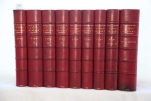 PICARD (Alfred) – Rapport général administratif et technique. Exposition universelle internationale de 1900 à Paris. Paris, Imprimerie Nationale, 1902-03. 9 vols. in-4° (21 x 29,5 cm) formant près de 3.500 pp. avec environ 480 pl. en phototypie. Ce rapport monumental récapitule et décrit tous les travaux entrepris pour l'Exposition Universelle de 1900 : restauration, créations, constructions… offre un panorama du monde à l’aube du XXe siècle et montrant l'évolution de l'architecture, du mobilier, des arts décoratifs, de la mode, etc. : Tomes 1 à 7, ce dernier doté d’une table générale très détaillée. Le Tome 8 contient 4 grands plans, imprimés en couleurs, dans un étui relié à l’identique : I. Enceinte urbaine, plan général, rez-de-chaussée (90 x 129 cm). II. Enceinte urbaine, plan général, premier étage (90 x 129 cm). III. Enceinte urbaine, plan général, services divers (90 x 129 cm). IV. Annexe du Bois de Vincennes, plan général (72 x 104 cm). Le Tome IX renferme toutes les pièces annexes : Actes officiels, Tableaux statistiques et financiers, etc. Ensemble en reliure d’époque demi-chagrin rouge à coins, dos à nerfs, date en queue, tête dorée, couvertures et dos conservés ; une tache en pied du tome 9, sinon beaux exemplaires, bien établis dans une reliure signée ‘Champs–Stroobants’. Rare dans cette condition. Ex-dono signé de l’auteur : Exemplaire offert « à Monsieur le Comte de Montaigu, Député / A. Picard » pour cet ouvrage exceptionnel sur l'histoire de l'Exposition Universelle de 1900.