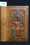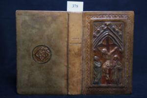 [Reliure] - [VENDÉE] – Le Livre du Chrétien. Offices de l’Église, Sacrements et Prières. Tours, Mame fils 1900, in-16 (9,8 x 15 cm) de xxxi-1056 pp. et un frontispice. Relié plein veau glacé havane clair, dos lisse, plat supérieur orné d’un décor en couleurs ciselé et modelé figurant le calvaire du Christ entouré de Marie et Marie-Madeleine, plat inf. aux initiales incisées ‘OG’ ; encadrement de rinceaux sur les contres-plats garnis de moire verte, daté ‘13 mai 1909’, toutes tranches dorées. Reliure signée ‘H. Mignard, rue St Sulpice 26’. Très belle reliure réalisée pour la communion d’Olivier Grimaud. Exemplaire contenant sur deux feuillets, trois dédicaces dont un sonnet signé E. Grimaud, père du communiant et deux billets signés M. Grimaud, mère du communiant et Charles Grimaud, son oncle. Ci-après une ébauche de généalogie : « Émile Grimaud (1864-1950), imprimeur né à Nantes, qui hérite de son père du don de la poésie et de l’écriture, publie dans ‘Le Terroir Breton’. Il épouse Marguerite Lecesne. Leurs fils Olivier fut imprimeur et directeur d’imprimerie. En 1948, il quitte Nantes pour la Vendée et s’installe aux Sables d’Olonne, prends sa retraite à Anetz où il décède en 1977. N’ayant pas d’enfant, sa maison, qui contenait une magnifique bibliothèque sur la Vendée historique, est vendue à la chandelle. Son oncle Charles Grimaud (1874-1950) prend la voie de la prêtrise et sera curé, frère des écoles chrétiennes… » (d’ap. Christian Frappier in ‘familles de vendée.fr’ 2018).