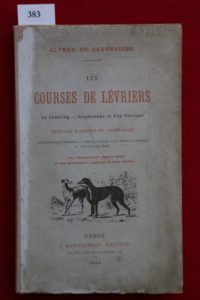 SAUVENIÈRE (Alfred de) - Les courses de Lévriers. Le Coursing - Greyhounds et Fox-Terriers. Préface d'Albert de Saint-Albin. Illustrations d'Arsénius, L. Jardon, Magnac, R.H. Moore, A. Wardle, A. de Sauvenière. Photographies d'après Nature et cinq Eaux-Fortes originales de Paul Mahler. Paris, J. Rothschild 1899. In-8° broché (22,8 x 14,2 cm), couverture doublée, dos factice, de xiii-352 pp., complet des 5 eaux-fortes sous serpentes, rousseurs. Édition originale. Réf. : Thiébaud II-830 : « Rare ».