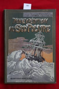 SHACKLETON (Sir Ernest) – Mon expédition au sud polaire 1914-1917. Tours, Mame, s. d. [1924], petit in-4° (21,5 x 31 cm) de 380 pp.- 2ff. illustrées de nombreuses photographies en noir in et hors texte et de 2 cartes dont une repliée. Cartonnage éditeur pleine percaline vert lierre, grande plaque polychrome sur le premier plat représentant le voilier ‘L'Endurance’ pris dans les glaces, auteur et titre dorés avec décor floral au dos, tranches dorées. Bel exemplaire. Édition originale française. Ernest Shackleton passa deux ans, perdu en Antarctique avec son équipage à lutter contre le froid, la faim, la glace, les intempéries, dans la plus inhospitalière région du globe. Il dut, avec son équipage, quitter ‘L'Endurance’, immobilisé et lentement écrasé par la pression des glaces.