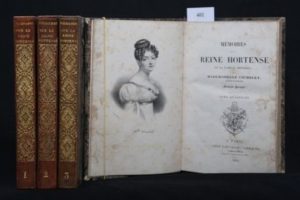 COCHELET (Louise) – Mémoires sur la Reine Hortense et la famille impériale, par Mademoiselle Cochelet, Lectrice de la Reine. (Madame Parquin.) Paris, Ladvocat 1836-1838, 4 vols. in-8° (13,3 x 20,5 cm) avec deux portraits lithographiés (la Reine Hortense et Mlle Cochelet). Reliure d’époque demi-basane marron, dos lisses ornés d’un large motif doré sur l’ensemble, tranches jaspées, rousseurs. Édition originale. « Ces mémoires de la lectrice de la reine Hortense sont riches en anecdotes sur les dernières années de l'Empire et l'exil de la reine. Leur authenticité a été mise en doute dès leur publication. Mais les historiens s'accordent pour estimer que la reine Hortense et Valérie Mazuyer ont utilisé les papiers laissés par Louise Cochelet pour les composer » Bertier 784 bis, Tulard 333.