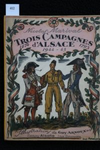 MARIVAL (Nicolas) - [ARNOUX] – Trois Campagnes d'Alsace. Trois étapes de la grandeur française.1674-1793-1945. Paris, Éditions Alsatia 1946, in-4° carré (22 x 27,5 cm) de 103 pp. illustrées de dessins en couleurs et d'une carte de Guy Arnoux. Cartonnage éditeur polychrome.