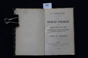 DESMARS (Jules) – La Presqu'île Guérandaise et les bains de mer de la côte - Saint-Nazaire, Pornichet, Le Pouliguen, Le Bourg de Batz, Le Croisic, La Turballe, Piriac, etc. - Guide du touriste. Redon, L. Guihaire 1869, in-18 de 181 pp. + 7 pp. de ‘Réclames’ in fine. Relié demi-chagrin bleu nuit, dos à nerfs surlignés de filets or. Bon ex., peu commun dans cette condition. Provenance : Bibliothèque du Marquis Pierre de Montaigu (1844-1927), La Bretesche, décédé à La Baule dans la belle villa Caroline, sise esplanade Benoît.