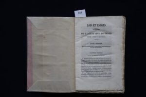 [FONTENELLE de VAUDORÉ (Armand-Désiré de La)] – Lois et usages maritimes de l'Aquitaine du nord (Poitou, Aunis et Saintonge). S.l.n.d. [Poitiers, Saurin imp. 1837-43 ?], vol. in-8° (14,5 x 22,5 cm) de 200 pp., brochées non rognées, sous couv. muette. Peu commun. Probablement un tiré à part extrait des "Mémoires de la Société des Antiquaires de l'Ouest" dont l’auteur, né au château de Vaudoré (1784-1847), était un correspondant assidu.