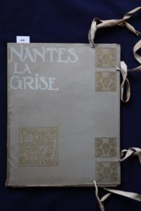 GRAND-JOUAN – Nantes la Grise. Lithographies originales d’après dessins sur nature. [Nantes], R. Guist’hau 1899, album gr. in-4° (26,5 x 33 cm) en feuilles sous couverture éditeur imprimée, cartonnée grise à lacets ; la chemise est fendue, petits manques en marge du contre-plat. Suite de 48 planches de lithographies in et hors texte, certaines en couleurs sur papier gris. Édition originale, tirage courant sur Vidalon limité à 500 exemplaires. Bon état intérieur, peu courant. « Fils de Nantes, Jules Grand-Jouan la voyait grise, ‘l’âme de Nantes me pénètre de sa douceur grise’. Les gris des lithographies de Grand-Jouan ne sont pas déprimants. Ils sont, au contraire d’une luminosité et d’une douceur délicieuse. On pourrait presque les dire chatoyants… Jules-Félix Grand-Jouan (1875-1968) n’a que 24 ans lorsqu’il compose ‘Nantes la grise’» d’ap. Gérard Lambert-Ullmann.