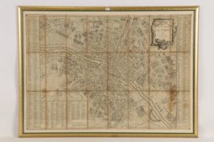 [ANONYME] - Plan routier de la ville et faubourgs de Paris - Paris; Lattré, 1772 - 1 plan gravé avec cartouche gravé en haut à droite - Quelques taches - 55x76,50 cm + marges - Entoilé d’époque - Encadré sous verre.