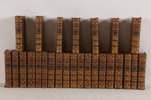 AUVIGNY (Jean du Castre d') - PÉRAU (Gabriel-Louis) - TURPIN (François-Henri) - Les vies des hommes illustres de la France, depuis le commencement de la monarchie jusqu’à présent - Amsterdam, Paris; Le Gras puis Knapen, 1739-1768 - 26 volumes grand In-12° - Reliure de l’époque veau havane granité (des coins émoussés à usés) - Dos à nerfs ornés (des coiffes accidentées) - Pièces de titre et de tomaison maroquin bordeaux et brun - Tranches rouges - Étiquette ex-libris armoriée aux 1ers contre plats des 6 premiers volumes : M. de Robelthon conseiller correcteur de la Chambres des comptes - Bon exemplaire en édition originale complète de cet ouvrage important, commencé par d'Auvigny (tomes I à XII), continué par l'abbé Pérau (tomes XIII à XXIII) et parachevé par Turpin, surnommé le « Plutarque français » (tomes XXIV à XXVI).