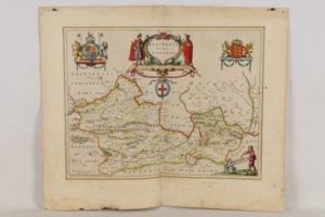 [CARTE GÉOGRAPHIQUE] - [BLAEU (Johannes)] - Bercheria Vernacule Bark Shire - [Amsterdam; J. Blaeu, 1645] tirée de Théâtre du Monde ou Nouvel Atlas - 1 carte géographique en feuille en coloris d’époque avec belles armoiries en haut à droite et à gauche, titre encadré au milieu en haut - Comté du Berkshire en Angleterre - 50x 61,50 cm avec les marges - Pliure centrale - Pâle et petite auréole en marge inférieure, papier légèrement effrité sur 1 partie de la marge inférieure, très petite galerie de vers aux angles supérieurs des marges - Bon état.