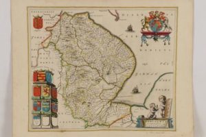 [CARTE GÉOGRAPHIQUE] - [BLAEU (Johannes)] - Lincolnia Comitatus. Anglis Lincoln-Shire - [Amsterdam; J. Blaeu, 1645] tirée de Théâtre du Monde ou Nouvel Atlas - 1 carte géographique en feuille en coloris d’époque avec belles armoiries en partie gauche, titre encadré en bas à droite - Comté du Lincolnshire en Angleterre - 50,50x61 cm avec les marges - Pliure centrale - Auréoles aux marges supérieure et inférieure - Bon état.