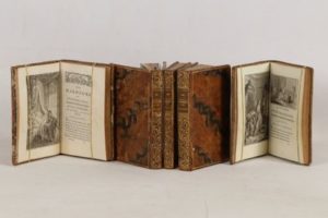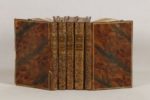 [DORAT (Claude-Joseph)] - [Œuvres]: Malheurs de l'inconstance […] Tomes I et II -:Amsterdam et Paris, Delalain, 1772 - La déclamation théâtrale […] - Paris; Delalain, 1771 - Mes fantaisies - Amsterdam et Paris; Delalain, 1770 - Lettres d’une chanoinesse de Lisbonne à Melour, officier françois […] - Amsterdam et Paris; Delalain, 1771 - 5 volumes In-8° -2 volumes touchés par des galeries de ver, certaines affectant le texte - 11 belles planches gravées hors texte dont frontispices - Reliure de l’époque veau porphyre (travail de ver avec manques à 6 plats, des coins émoussés) - Dos lisses ornés (1 avec petit manque)- Pièces de titre maroquin havane - Tranches dorées.