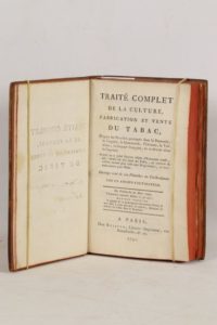 [TABACOLOGIE] - [VILLENEUVE (de)] - Traité complet de la culture, fabrication et vente du tabac, d’après les procédés pratiqués dans la Pannonie, la Virginie, le Danemarck, l’Ukraine, la Valteline, la Guyane françoise, et ci-devant dans la Guyenne […] - Paris; Buisson, 1791 - 1 volume In-8° - 2 feuillets quasi-détachés - 6 planches dépliantes gravées in texte au complet - Reliure de l’époque basane havane marbrée - Dos à nerfs orné (petit trou de ver au 1er caisson) - Pièce de titre maroquin vert - Tranches rouges - Ex-libris manuscrit ancien au faux titre: Bigotte notaire public à Punerot - Bon et rare exemplaire en édition originale.