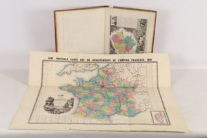 [ATLAS GÉOGRAPHIQUE] - LEVASSEUR (V.) - Atlas national des 89 départements et des possessions de la France divisé par arrondissements, cantons et communes avec le tracé de toutes les routes, chemins de fer et canaux - Paris; Pelissier, 1861 - 1 volume In-folio - Beau titre gravé et 101 cartes gravées rehaussées en couleurs (la carte dépliante de la France est manquante) - On y joint: 1 grande carte dépliante en feuilles en couleurs: Nouvelle carte des 89 départements de l’Empire français 1861 dressée par Vuillemin éditée à Paris Par Pick - Reliure éditeur demi-basane rouge (petite fente partielle aux mors, dos décollé en queue) - Titre doré dans encadrement au 1er plat (insolé) - Dos (frotté) à nerfs orné et titré or .