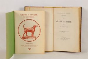 [CHASSE] - Ensemble de 2 volumes - CERFON (C.) - La chasse sous terre - Vincennes; Aux Bureaux de l’éleveur, 1885 - 1 volume In-8° - Des croquis gravés sur bois, la plupart à pleine page, de chiens, instruments et gibiers - Reliure de l’époque demi-toile citron à la Bradel (1er plat légèrement piquée) - Dos orné et daté or avec pièce de titre maroquin brun - Bon exemplaire en édition originale de ce classique du déterrage, avec la description des chiens de déterrage - ARMAILLÉ (Marqué d’) - Chasse à courre du chevreuil. Quelques observations à ce sujet adressés à mon fils - Pau; E. Marrimpouey Jeune, 1920 - 1 volume In-8° agrafé sous couverture illustrée au 1er plat, illustration reprise au frontispice - Nouvelle édition imprimée en rouge, quelques rares passages soulignés - Bon exemplaire numéroté (n°50 sur les 175 de tirage total).