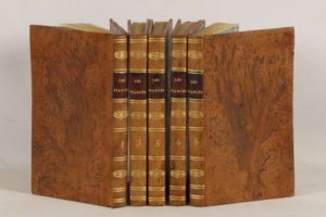 MANZONI (Alex.) - Les Fiancés, histoire milanaise du XVIIe siècle, découverte et refaite - Paris; Charles Gosselin, A. Sautelet et Cie, 1828 - 5 volumes In-12° - Reliure de l’époque basane fauve marbrée (quelques menus défauts aux plats) - Dos lisses ornés et tomés or - Pièces de titre maroquin brun - Tranches jaunes mouchetées de rouge - Bon exemplaire.