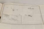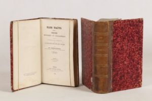 [OCÉAN PACIFIQUE - POLYNÉSIE] - VINCENDON-DUMOULIN DESGRAZ (Clément Adrien) - Îles Taïti. Esquisse historique et géographique précédée de Considérations générales sur la colonisation française dans l'Océanie - Paris; Arthus Bertrand, 1844 - 2 volumes In-8° - Quelques rousseurs et feuillets jauni, auréole partielle en bas du faux titre et du titre du tome I - 2 cartes dépliantes gravées hors texte in fine du tome I - Reliure de l’époque demi-basane brune (superficiellement épidermée, petits frottements partiels aux mors, coin inférieur du tome I choqué) - Dos à nerfs ornés titrés et tomés or - Tranches mouchetées de brun - Très rare édition originale et unique de l'ingénieur hydrographe Vincendon-Dumoulin (1811-1858). Tahiti venait, comme les Marquises, d'être «couverte du pavillon national» (p. xv) et devenait protectorat français après avoir été colonisée par les missionnaires protestants anglais.