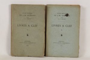 QUÉRARD (Joseph Marie) - Livres à clef - Bordeaux; Charles Lefebvre, 1873 - 2 volumes In-8° brochés (1 petite tache d’encre noire au 1er plat du 2nd volume) - Feuillet du faux titre et de la justification du 1er volume arraché - Rare et bon exemplaire en édition originale posthume publiée par G. Brunet tirée à 300 exemplaires sur papier vergé (le nôtre non numéroté).
