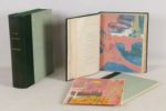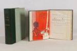 APOLLINAIRE (Guillaume) - Alcools - [Paris]; Éditions Lidis, 1966 - 1 fort volume In-folio - Dessins en noir in texte et 19 lithographies originales hors texte en couleurs de Paul Guiramand - Belle reliure éditeur chagrin vert sous étui demi-chagrin vert titré or au dos et plats de moire vert d’eau - Contre plats et garde doublés de moire vert d’eau - 1er plat largement mosaïqué d’1 décor dans différents tons de vert - Dos lisse titré or - Tête dorée - Très bel exemplaire numéroté sur vélin d’Arches (n°21 sur les38, tirage total: 250 + 43 hors commerce) avec suite des illustrations dans portfolio à part demi-chagrin vert aux plats moirés vert d’eau.