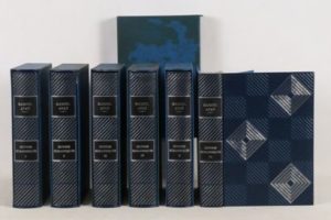 AYMÉ (Marcel) - Œuvres romanesques - Paris; Flammarion, 1977 - 6 volumes In-4° - Illustrations hors texte couleurs de Roland Topor - Reliure éditeur chagrin marine ornée de motifs géométriques argentés frappés à froid, emboîtages bordés - Dos lisses ornés à l’identique - Pièces de titre et de tomaison noires - Têtes argentées - Très bon exemplaire numéroté sur vergé.