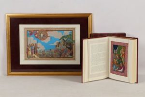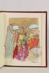 BÉDIER (Joseph) - Le roman de Tristan et Iseut - Paris; Édition d’Art H. Piazza, 1980 - 1 volume In-4° - Texte encadré d’1 large frise de couleurs - Illustrations hors texte rehaussées en couleurs au pochoir de Ansaldi - Reliure éditeur chagrin maroquiné prune sous emboîtage bordé - Plats richement frappés à froid et or, 1er plat orné de personnages en son centre - Dos à nerfs frappé or et à froid et titré or - Tête dorée - Très bel exemplaire numéroté sur vélin d’Arjomari (n°119 sur les 200 de tirage de tête, tirage total: 2000, série réservée aux Éditions Arts et Couleurs), avec 1 illustration originale en couleurs signée, 1 planche hors texte en couleurs encadrée, 1 suite en bistre des hors texte reliée in fine - Certificat d’éditeur.