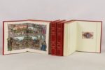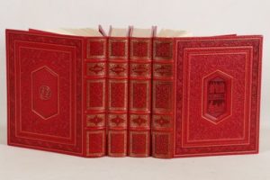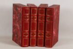 BOUCHER (Lucy) GRADASSI (Jean) - Les grands précurseursde la pensée sociale : Platon, Aristote et Lucrèce - Monte Carlo; Éditions Arts et Couleurs, 1978-1980 - 4 volumes In-4° - Texte encadré d’1 frise en couleurs et illustrations couleurs hors texte par Jean Gradassi aux tomes I et II et de Lucy Boucher aux tomes III et IV - Reliure éditeur chagrin maroquiné cerise sous emboîtages bordés - Plats encadrés de filets or et à froid et richement frappés à froid, décor antique animé aux 1ers plats - Contre plats et gardes de moire cerise - Dos à nerfs ornés or et à froid, titrés et tomés or - Têtes dorées - Très bon exemplaire numéroté (n°472 sur les 300, tirage total: 2413) avec suite in fine de chaque volume et 1 illustration originale en couleurs signée de Lucy Boucher in fine du tome IV - Certificat d’éditeur.