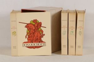 CERVANTÈS SAAVEDRA (Miguel de) - L’ingénieux Hidalgo Don Quichotte de la Manche - Sans lieu ; Éditions Terres Latines, 1947 - 4 volumes In-8° brochés non coupés sous couvertures rempliées illustrées couleurs aux 1ers plats, emboîtage commun - Frontispices, vignettes aux titres et compositions sur bois in texte en plusieurs tons de René de Pauw - Très bon exemplaire numéroté sur Alfa.