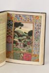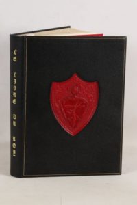 [CHASSE] - FERRIÈRES (Henry de, Seigneur de Gisors) - Le livre du Roy Modus et de la Royne Ratio - Nice; Joseph Pardo, 1963 - 2 tomes en 1 volume In-folio - Texte richement enluminé en couleurs et or (têtes de livres et bordures enluminées) de Arnaud Ansaldi, 10 belles planches hors texte en couleurs et or de Jean Gradassi - Reliure éditeur chagrin noir sous étui demi-chagrin noir titré or au dos et moire cerise aux plats - Filet d’encadrement aux plats, grande pièce centrale de chagrin cerise frappée à froid au 1er - Contre plats et gardes doublés de moire cerise - Dos lisse titré or - Tête dorée et ciselée à motifs de fleurs de lys - Très bel exemplaire numéroté (n°542 sur les 750, tirage total: 1147 + 20 hors commerce).