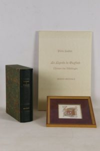 [CHEVALERIE] - La légende de Siegfried - Chanson des Nibelungen - Traduction de Maurice Betz - [Versailles]; Éditions d’art du Rameau d’Or, 1996 - 1 fort volume In-folio - Illustrations et ornementations à chaque page, compositions hors texte rehaussées en couleurs au pochoir par Pierre Joubert - Reliure chagrin vert foncé de l’éditeur frappé d’1 encadrement à froid aux 2 plats et d’1 médaillon émaillé illustré de Pierre Joubert représentant 2 personnages en couleurs au centre du 1er plat, emboîtage vert marbré et bordé - Dos à nerfs orné de motifs chevaleresques frappés à froid, titre doré - Tête dorée - Dentelle intérieure dorée - Contre plats et gardes blanches moirées - Tête dorée - Très bon exemplaire lettré (B sur les 2 exemplaires d’éditeur, 2nd tirage de tête après 1 exemplaire unique, tirage total 400 + quelques exemplaires hors commerce), de 2 lettrines originales, d’1 série d’originaux d’étude (2 études de page de titre, 1 étude de dessin en noir, 1 étude de lettrine en noir, 2 études d’ornementation dont 1 en en couleurs), sous chemise titrée or, d’1 suite en couleurs, sans la suite du trait en sienne naturelle des illustrations pleine page ni la planche originale de l’édition signée et encadrée, enrichi d’1 lettrine en couleurs signée et encadrée - On y joint: le prospectus de présentation de l’ouvrage sur 6 pages In-4°. Pour plus de détails: https://www.pierre-joubert.fr/1996-la-legende-de-siegfried-album/