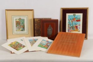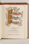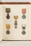 [CHEVALERIE] - STEENACKERS (F. F.) - Histoire des ordres de chevalerie et des distinctions honorifiques en France - [Versailles]; Éditions du Rameau d’Or, 1995 - 1 fort volume In-folio - Texte sur 2 colonnes ornementé en couleurs - Vignettes in texte, têtes de chapitres, dessins in texte, 8 planches hors texte et lettrines en couleurs, le tout rehaussé à l’aquarelle au pochoir, par Pierre Joubert - Nombreuses planches de médailles en couleurs - Reliure éditeur chagrin havane sous emboîtage bordé - Filets d’encadrement bruns et dorés et frise sur fond brun frappée à froid, fleurs de lys aux angles - Au centre du 1er platfigure 1 templier en métal argenté en relief au centre d’1 cadre rectangulaire - 2nd plat encadré de filets à froid, d’1 frise à l’identique et d’armes centrales frappées en brun - Contre plats et gardes de moire cuivre - Dos à nerfs orné à froid et titré or - Tête dorée - Très bel exemplaire lettré B (sur les 2 exemplaires d’éditeur, après l’exemplaire unique, tirage total: 400 + quelques hors commerce), avec 1 planche originale de l’édition signée et encadrée, de l’original d’1 page de titre, d’1 lettrine originale, d’1 série d’originaux d’étude (1 grand dessin au crayon, 1 lettrine en noir) sous portfolio titré or, d’1 illustration hors texte en couleurs encadrée et signée, d’1 suite en couleurs (dans portefolio demi-chagrin havane), et d’1 suite du trait en sépia des illustrations pleine page (reliée in fine). Pour plus de détails: https://www.pierre-joubert.fr/1995-histoire-des-ordres-de-chevalerie-album/