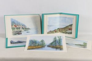 CLAVEL (Bernard) - Les contes du Léman - Perroy; Éditions d’Art Hifach, 1988 - 1 volume In-folio en feuillets sous couverture rempliée titrée au 1er plat, sous coffret de toile verte avec fenêtre hublot en métal doré au 1er plat protégeant 1 aquarelle originale de Rémon - Pièce de titre cuir vert bouteille au dos - Illustrations in et hors texte, certaines à double page, de Jean-Pierre Rémon rehaussées à l’aquarelle par l’artiste - Très bon exemplaire numéroté sur vélin d’Arches (n°75 sur les 125, tirage total 298 + quelques hors commerce), signé par Clavel et Rémon à la justification, avec portefeuille de suites des 12 planches et enrichi de 3 planches doubles non mentionnées dans la justification.
