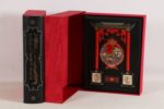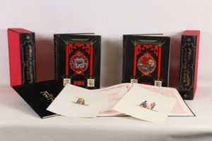 CONFUCIUS - Kong Fou Tseu. Les quatre piliers de la sagesse. Adaptation de Joseph Pardo - Nice; Éditions d’Art Sefer, Le Chant des Sphères, Monaco; Éditions Arts et Couleurs, 1988-1989 - 2 forts volumes In-folio - Illustrations et encadrements originaux rehaussés en couleurs et or au pochoir à chaque page in et hors texte par Jean Gradassi - Impressionnante reliure d’art de l’éditeur plein cuir noir aux plats biseautés, les 1ers frappés à froid à décor de temple en relief avec ornements et colonnes de bois laqué rouge, plaque centrale émaillée polychrome, et 2 dragons sur plaques d’ivoirine incrustés, sous emboîtages demi cuir noir (dos à l’identique), avec plats de moire rouge - Contre plats et gardes de moire rouge - Dos lisses frappés à froid, titrés et ornés or - Têts dorées - Très bel exemplaire, à l’état de neuf, numéroté sur vélin d’Arches (n°118 sur les 150, tirage total: 1200) comprenant 2 illustrations couleurs signées inédites, 1 suite du trait en laque rouge chine des illustrations in et hors texte sur vélin d’Arches - Certificats d’authenticité - Très bel exemplaire du dernier ouvrage enluminé par Jean Gradassi.
