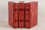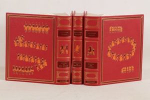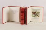 DAUDET (Alphonse) - Lettres de mon moulin - Tartarin de Tarascon - Contes du lundi - Paris; Éditions d’Art Les Heures Claires, 1978 à 1981 - 3 volumes In-4° - Texte encadré, illustrations in texte en couleurs, et culs-de-lampe en gris d’Henry Lemarié - Reliure éditeur chagrin maroquiné framboise sous emboîtages bordés - Plats encadrés de filets or et brun ornés de personnages oranges, bruns et dorés formant 1 ronde frappés aux plats - Dos à nerfs ornés à l’identique et titrés or - Gardes moirées de blanc - Tranches dorées - Très bons exemplaires numérotés sur grand vélin de Rives avec envoi autographe signé de Henry Lemarié au dernier volume: «A Monsieur Bernard A6770 ces «Contes du Lundi», un peu mélancoliques que depuis mon enfance je souhaitais illustrer et [qui] furent une de mes premières lectures. En bien amical hommage.»