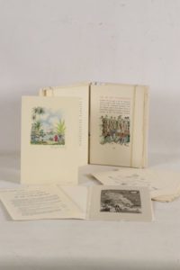 DERENNES (Charles) - La vie et la mort de M. de Tournèves - Paris; Marcel Lubineau, 1961 - 1 volume In-8° en feuilles, sous couverture rempliée, chemise titrée or au dos et emboîtage - 25 fines illustrations in et hors texte rehaussées en couleurs au pochoir par Henry Lemarié - Très bel exemplaire numéroté sur vélin de Rives (n°6 sur les 15, tirage total: 750 + 25 hors commerce), avec 1 suite en noir, 1 frontispice gravé tiré sur soie et 1 aquarelle originale signée par l’artiste. Ce roman a pour cadre les Antilles à l'époque de la Révolution.