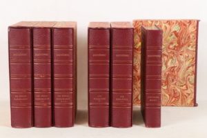 DOSTOÏEVSKI (Fédor) - Les Frères Karamazov (tomes I, II et III) - L’éternel mari - Les possédés (tomes I et II) - Sans lieu; Éditions de l’Odéon, Édition André Vial, 1967-1968 - 6 volumes In-4° - Illustrations hors texte en couleurs de Edy-Legrand, Grau Sala, et Michel Ciry - Reliure éditeur chagrin maroquiné bordeaux sous emboîtages bordés - Large frise dorées aux plats, monogramme doré FD aux 1ers plats - Dos à nerfs ornés, tomés et titrés or (très léger frottement au dos du tome II des Frères Karmazov) - Têtes dorées - Très bon ensemble numéroté sur vélin de Lana.