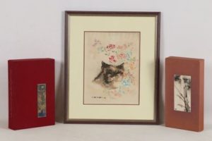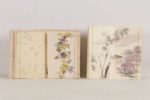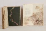 Ensemble de 2 volumes - GANDON (Yves) - Le pavillon des délices regrettés - Sans lieu; Pierre de Tartas, Éditions Rombaldi, 1961 - 1 volume In-4° étroit en feuilles sous couverture illustrée couleurs et gaufrée au 1er plat et étui de percale violette (partiellement passée) doublé de suédine rouge avec incrustation d’1 plaque émaillée illustrée en couleurs au 1er plat - 22 aquarelles originales in et hors texte de Viêt-Hô - Très bon exemplaire numéroté sur japon nacré (n°5 sur les 40, tirage total: 120), avec 2 illustrations sur soie, sans la grande soie mentionnée à la justification mais avec 1 aquarelle originale signée et encadrée - [COLLECTIF] - Floralies - Paris, Bièvres; Pierre de Tartas, 1967 - 1 volume In-4° en feuilles sous couverture rempliée et étui toilé rouge avec plaque émaillée incrustée au 1er plat et titre doré au dos - Poèmes de Verlaine, Rimbaud, Ronsard, Charles d'Orléans, Joachim du Bellay, etc. illustrés de 12 compositions sur soie hors texte peintes à la main par Viêt-Hô toutes signées au dos - Imprimé sur papier à la main des moulins Richard de Bas avec des incrustations de fougères et fleurs sauvages - Très bon exemplaire numéroté (n°59 sur 150 de tirage total), avec signatures de l'artiste, de l'éditeur et avec cachet d'huissier.