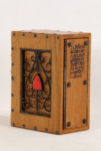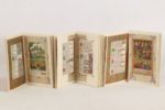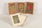 Ensemble de 3 volumes In-12° de la collection Les Chansons du Moyen-âge édités à Monte-Carlo Nice par les Éditions de l’Acanthe en 1959 - CHARTIER (Alain) - La Belle Dame Sans Mercy - Les Chansons de Jauffré Rudel - Les Chansons de Colin Muset - Les 3 volumes en feuilles sous couvertures richement illustrées couleurs et or, chemise éditeur de bois cloutée et titrée en pyrogravure au dos, et étui de bois clouté au 1er plat orné d’1 décor de ferronnerie ajouré avec en son centre 1 pièce émaillée rouge (petit éclat) - «L’étui composé d’après les matériaux utilisés au Moyen-âge a été exécuté par un groupe d’artisans de Vallauris» - Textes en caractères gothiques, belles enluminures et illustrations miniaturistes de Jean Gradassi en couleurs et or à la main au pochoir - Très bel exemplaire numéroté sur japon super nacré (n°11 sur les 20, tirage total: 551 + 20 hors commerce), sans le bois gravé signalé à la justification mais avec et 1 dessin original en couleurs signé en marge et enrichi d’1 original de page enluminée signé au verso.