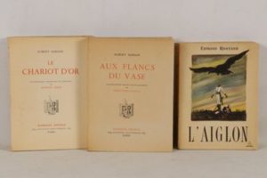 Ensemble de 3 volumes In-8° brochés sous couvertures rempliées - SAMAIN (Albert) - Aux flancs du vase - Paris; Rombaldi Éditeur, 1941 - Illustrations originales hors texte en couleurs de Ferdinand Fargeot - Très bon exemplaire numéroté sur vergé Agnella - SAMAIN (Albert) - Le chariot d’or - Paris; Rombaldi Éditeur, 1941 - Illustrations originales hors texte en couleurs de Maurice Leroy - Très bon exemplaire numéroté sur vergé Agnella - ROSTAND (Edmond) - L’aiglon - Paris; Éditions du Panthéon, 1950 - 10 illustrations couleurs hors texte de Jean Gradassi - Très bon exemplaire numéroté sur vélin.