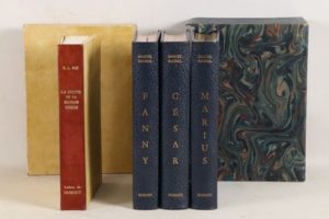 Ensemble de 4 volumes: POE (Edgar Allan) - La chute de la maison Usher suivie d’autres nouvelles extraordinaires - Monte Carlo; Aux Éditions du Livre, 1948 - 1 volume In-8° broché sous couverture rempliée, chemise demi-basane havane titrée or au dos et emboîtage - Planches couleurs hors texte en couleurs dont frontispice par Dubout - Très bon exemplaire ,numéroté sur grand vélin blanc - PAGNOL (Marcel) - Marius - César - Fanny - Sans lieu; Éditions Michèle Trinckvel / Éditions André Sauret, 1980 - 3 volumes In-8° - Frontispices couleurs, vignettes noires in texte et compositions lithographiées en couleurs d’après Dubout - Reliure éditeur chagrin maroquiné bleu ornée d’1 rose des vents marine or et bleue aux 1ers plat, emboîtage doublé commun - Têtes dorées - Très bon ensemble numéroté sur grand vélin blanc.