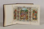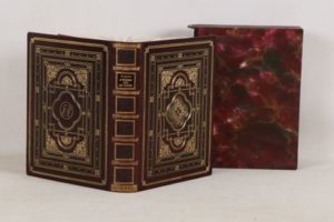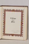 ÉRASME - ESSARTS (Emmanuel des, traducteur) - L’éloge de la folie - Monte Carlo; Le Chant des Sphères, Nice; Éditions d’Art Sefer, 1987 - 1 volume In-4° - Texte encadré d’1 large frise en couleurs - Illustrations hors texte rehaussées au pochoir en couleurs, dont dépliantes, par Philippe Reder - Reliure éditeur basane brune sous emboîtage bordé - Filets dorés d’encadrement et riches ornementations en noir et or - Contre plats et gardes doublés de moire framboise - Dos à nerfs ornée or et brun - Tête dorée - Très bel exemplaire numéroté sur vélin d’Arches (n°385 sur les 300, tirage total: 1900 + 100 hors commerce), avec 1 suite du trait en violet amarante des illustrations pleine page reliée in fine, sans l’illustration en couleurs encadrée mentionnée à la justification.