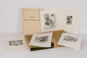 FABRE (J.-H.) - Quelques souvenirs entomologiques - Sans lieu; Les Pharmaciens Bibliophiles, 1966 - 1 volume grand In-4° en feuilles sous couverture rempliée, chemise titrée au dos (insolé et auréolé) et emboîtage (partiellement insolé) - Pointes-sèches in texte originales par André Jacquemin - Très bon exemplaire sur vélin d’Arches (n°116 sur les 190), avec l’1 des 12 suites des illustrations en état définitif avec remarques, numérotées sur Japon Hosho .