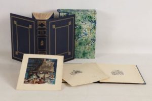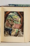 FOË (Daniel de) - Vie et surprenantes aventures de Robinson Crusoé - Paris; Éditions des Vents Alizés, [1937] - 1 volumes In-4° - Titre orné d’1 rose des vents en couleurs, 20 aquarelles hors texte coloriées au pochoir et 108 dessins en noir in texte par Pierre Noël - Reliure éditeur chagrin marine sous emboîtage bordé - 1ère couverture illustrée couleurs conservée - Contre plats et gardes de moire marine - Dos à nerfs orné et titré or - Tête dorée - Très bon exemplaire sur Hollande Van Gelder (l’1 des 12?), justifié, non numéroté (tirage total: 815), avec suite en noir reliée à la suite des hors texte et enrichi d’1 chemise demi-chagrin marine contentant: 1 dessin original à l’aquarelle signé de l’artiste, et 31 planches des dessins originaux in texte à l’encre de Chine, la plupart signées ou monogrammées par l’artiste.