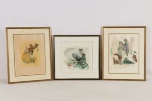 FONTANAROSA - Ensemble de 3 planches en couleurs ayant servi à l’illustration de l’ouvrage Les quatre fils Aimon édité à Paris par l’Union Latine d’Éditions en 1972 dans la Collection médiévale: 1 aquarelle originale signée en bas à gauche (27x28 cm à vue), et 2 lithographies couleurs signées dans la planche en bas à droite (des rousseurs marginales à l’1 d’entre elles - Les 3 encadrées sous verre.