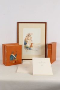 [GASTRONOMIE] - BRILLAT-SAVARIN (Jean-Anthelme) - Physiologie du goût, méditations de gastronomie transcendante - Paris; Nouvelle Librairie de France, Guy-Victor Labat, 2001 - 1 fort volume In-4° - 75 aquarelles en couleurs de Fordan in et hors texte - Reliure éditeur basane fauve joliment ornée d’1 gastronome or et couleurs attablé au 1er plat sous emboîtage plein cuir à l’identique - Contre plats et gardées doublés de moire crème - Dos à nerfs orné et titré or - Tête dorée - Très bon exemplaire numéroté sur vélin d’Arches pur chiffon (n°13 sur les 50, tirage total: 2150 + 25 hors commerce), avec 3 suites en feuilles des illustrations hors texte en couleurs sur vélin d’Arches et 1 suite des illustrations en couleurs in texte, el tout sous portfolio et emboîtage à l’identique de la reliure et 1 aquarelle originale de Fordan sur vélin Vincin au format demi-raisin signée et encadrée.