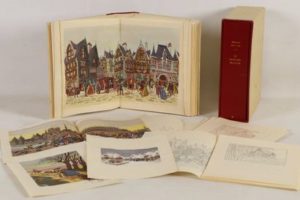 GAUTIER (Théophile) - Le Capitaine Fracasse - Marseille; Éditions «Le Corsaire», Albert Simide, 1947 - 2 volumes In-8° en feuilles sous couvertures rempliées, chemises demi-cuir bordeaux titrées et tomées or aux dos - Aquarelles originales in et hors texte, certaines sur double page, rehaussées en couleurs au pochoir par Jean Gradassi - Très bon exemplaire numéroté sur japon Zuber-Riéder (n°10 sur les 17, tirage total: 390 + 20 hors commerce), signé par l’artiste, avec 1 dessin original en couleurs, 1 état de toutes les planches en noir, 1 état de toutes les planches tiré en sanguine et 1 bon à tirer d’1 hors texte en couleurs signé par l’artiste.