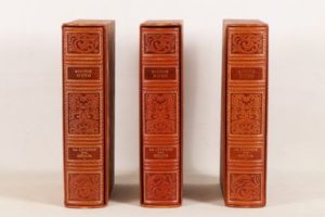 HUGO (Victor) - La légende des siècles - Monte Carlo; Arts et Couleurs, Le Chant des Sphères, 1975-1976 - 3 volumes grand In-4° - Illustrations in et hors texte en couleurs (dont double page), culs-de-lampe dorés de Rino Ferrari - Texte imprimé sur pages filigranées d’illustrations couleurs - Reliure éditeur pleine peau maroquinée havane, plats ornés de décors frappés à froid, emboîtages bordés - Dos à nerfs ornés à l’identique - Têtes dorées - Très bon exemplaire numéroté sur Vélin de Lana.