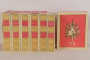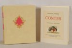 LA FONTAINE (Jean de) - Contes - Paris; Éditions d’Art Les Heures Claires, [vers 1965] - 6 volumes grand In-8° en feuilles sous couvertures rempliées, titrées et ornées, chemises cartonnées crèmes et roses, ornées et titrées aux 1ers plats et aux dos titrés or, emboîtages crèmes et roses ornés à l’identique - Texte encadré, culs-de-lampe, vignettes en couleurs aux titres et nombreuses illustrations miniaturistes in texte rehaussés en couleurs au pochoir d’Henry Lemarié - Très bel exemplaire numéroté sur vélin de Rives (n°116 sur les 114, tirage total: 3450) avec les volumes respectifs de suites comportant 1 suite en couleurs des illustrations, 1 suite en noir avec remarques du trait gravé sur cuivre, 1 suite en noir, 1 décomposition des couleurs.
