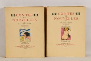 LA FONTAINE (Jean de) - Contes et nouvelles - Paris; Gibert Jeune, 1937-1938 - 2 volumes In-4° brochés sous couvertures rempliées avec vignettes couleurs aux 1ers plats et aux dos - 16 planches hors texte en couleurs (dont frontispices) et 35 dessins en noir in texte de Umberto Brunelleschi - Très bon exemplaire numéroté.
