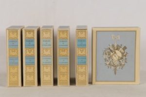 LA FONTAINE (Jean de) - Fables - Paris; Éditions d’Art Les Heures Claires, 1962-1966 - 6 volumes grand In-8° en feuilles sous couvertures rempliées, titrées et ornées, chemises cartonnées crèmes et roses, ornées et titrées aux 1ers plats et aux dos titrés or, emboîtages crèmes et roses ornés à l’identique - Texte encadré, culs-de-lampe, vignettes en couleurs aux titres et nombreuses illustrations miniaturistes in texte en couleurs au pochoir d’Henry Lemarié - Très bel exemplaire numéroté sur vélin de Rives (n°116 sur les 114, tirage total: 3450) avec les volumes respectifs de suites comportant 1 suite en couleurs des illustrations, 1 suite en noir avec remarques du trait gravé sur cuivre, 1 suite en noir, 1 décomposition des couleurs.
